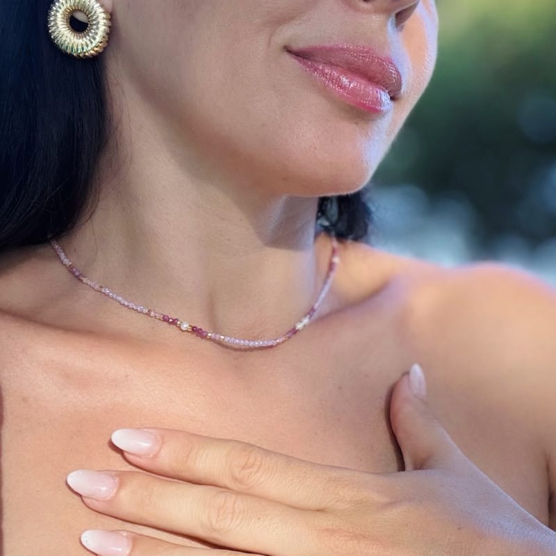 Um colar minimalista em tons suaves de rosa, realçado por pedras naturais que evocam a delicadeza do amanhecer. Leve e elegante, é a peça perfeita para transmitir feminilidade, ternura e sofisticação no dia a dia