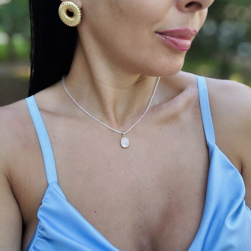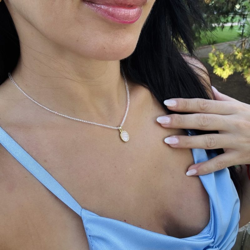 Um colar delicado com pingente de madrepérola, que reflete a luz suave da lua.